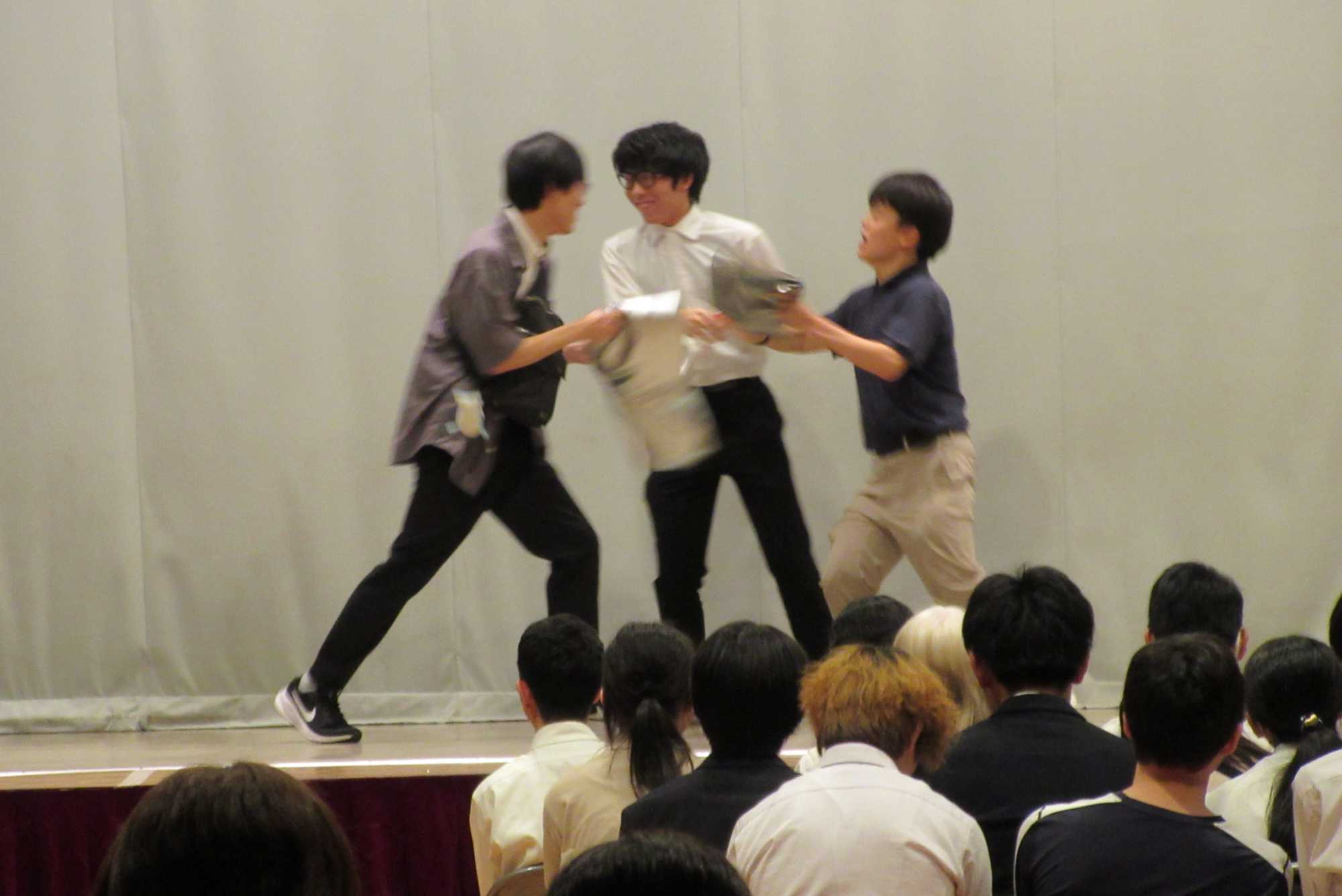午前中は、文化祭実行委員が企画した全体ゲームと、学年ごとの舞台発表を実施。ゲームでは、学年を超えたチームでスリーヒントクイズやイントロクイズに挑戦し、笑いや歓声があふれました。舞台発表では、サスペンス劇やユーモラスな演劇、合唱など、各クラスの個性が光る演目が披露されました。