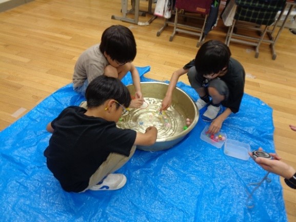 各コーナーでは、冷たさに触れたり、音を楽しみながら体を動かしたり、氷の甘さに笑顔をこぼしたりと、子どもたちの楽しそうな姿がたくさん見られました。そして最後は、みんなが楽しみにしていたエアートランポリンです。体育館ならではのダイナミックな活動に、子ども達は大喜びでジャンプしたり揺れを楽しんだりし、歓声と笑い声が体育館いっぱいに響きました。