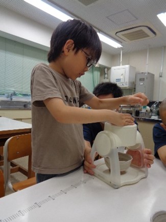 二日目では、夏を意識したスーパーボールすくいやすいかわりゲーム、かき氷づくりを行いました。冷たい氷をじっくり見たり触ったりして確かめ、かき氷機を使ってガリガリと自分たちで削っていきます。2日間がんばった後に食べたかき氷は、特別おいしかったようです。閉校式では、「寄宿舎の大きなお風呂に入ることができたことが楽しかった!」「かき氷が冷たくておいしかった!」「スーパーボールすくいで最高記録が出た!」「あっという間に終わってしまったので、また泊まりたい!」とそれぞれの感想を発表しました。感想から、体験学習への達成感や満足感が溢れていました。