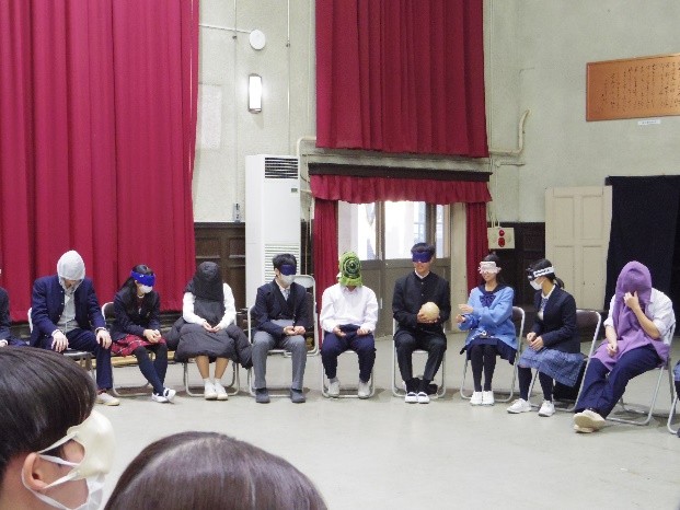 午前の部では、1年生が文化祭の準備で起こった道具の破損をきっかけに仲間外れの状態が生じたものの、生徒同士で問題を解決していく物語(自作)、笑いを交えながら演じました。2年生は、クラスが文化祭で何を行うかを話し合い、合奏を完成させる物語(自作)を演じました。実際に合奏も行いました。3年生は、ハロウィーンでの学校での幽霊と対決する物語(自作)を通じて、クラスで仲良くすることの大切さを表現しました。