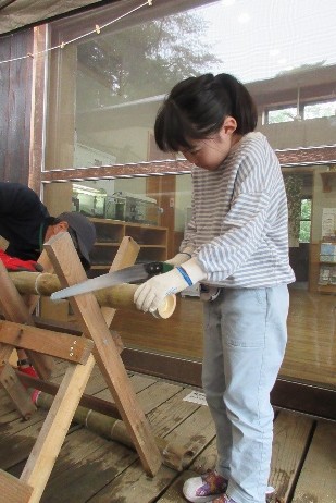 10月10日(金)、11日(土)に4、5年生で移動教室に行きました。1日目は府中市郷土の森博物館で、石臼体験や博物館の展示見学、園内散策をしました。宿泊は高尾の森わくわくビレッジで、グランド遊具遊び、キャンプファイヤー、大きなお風呂、朝ごはんのバイキングなど楽しく過ごしました。2日目は高尾の森自然学校でハイキングの予定でしたが、雨天のため、竹工作を行いました。一人一人のこぎりで竹を切り、素敵なコップとマラカスができました。先生、友だちと色々な経験をし、楽しい時間を過ごすことができました。
