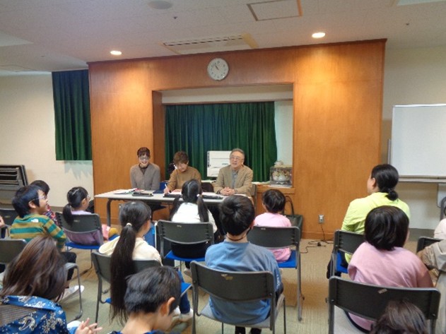 11月10日(月)、元TBSアナウンサーの長峰由紀さん、柴田秀一さん、水野真裕美さんが、今年も小学部を訪れてくださいました。今年は、読書会が始まってから、ちょうど20年目になります。初回からこの読書会を作り上げていってくださった長峰さん。長らく一緒に支えてくださっている柴田さんと、水野さん。柴田さんは、毎回その年の時の人になりきって登場してくださいます。昨年は『デコピン』で、今年は、何と『バイキンマン』でした!
