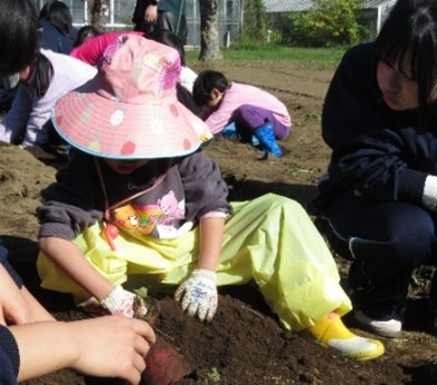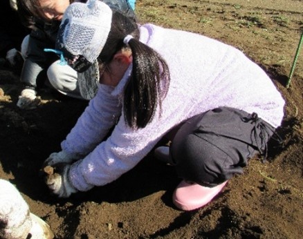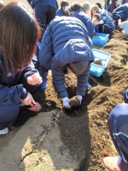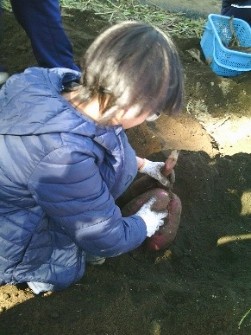 畑には、坂戸高校の農業を学ぶ生徒たちが丹念に育ててくれた立派なさつま芋が眠っていました。児童は、懸命に手指を動かし、畑を掘り、掘り、掘り…しかし、大きく、太いさつま芋はなかなか「顔」を出しません。畑のあちこちから「うんとこしょ、どっこいしょ。」といったかけ声や、「さつま芋、大きいよ。」、「全然、抜けない。」、「デカすぎ!」といったにぎやかな声が聞こえてきました。