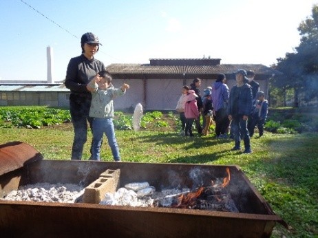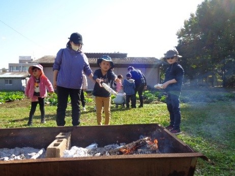 また、焼き芋体験では、たき火の熱さや煙のにおいを全身で感じ、味わいながら、「かまど」にさつま芋を投げ入れました。普段の学校生活では、たき火や、焼き芋をつくる機会はなく、児童にとって貴重な経験になったことと思います。