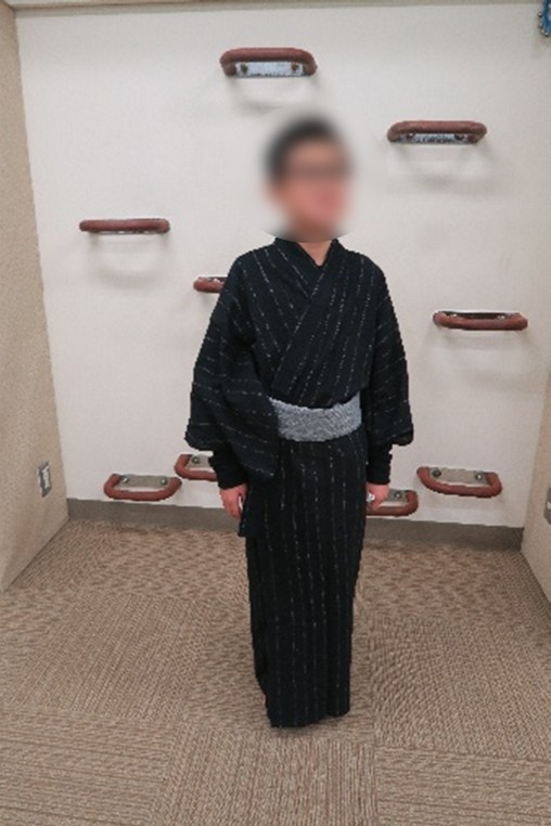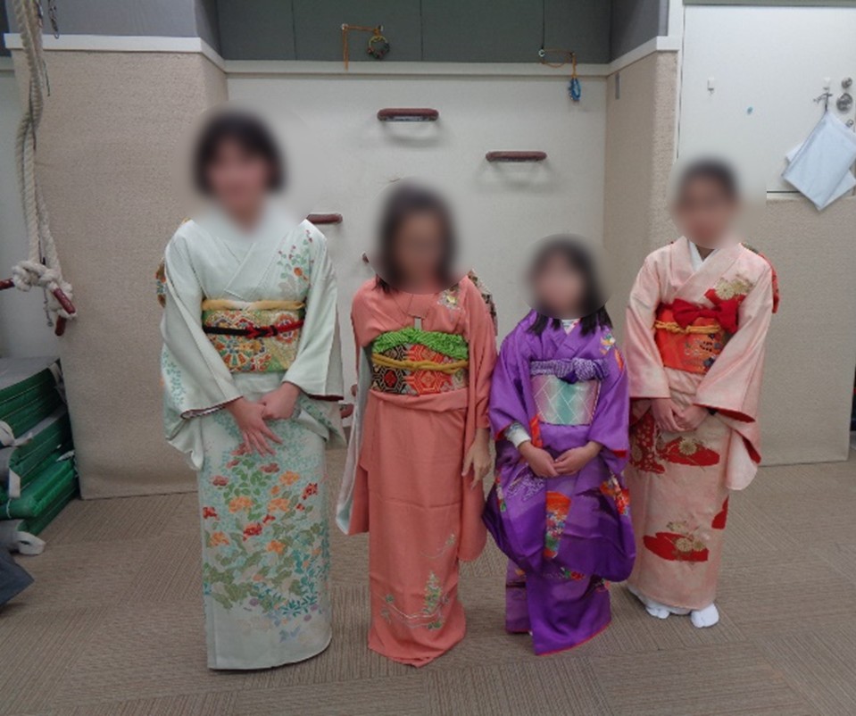 今年度初めてできた「日本文化クラブ」では、様々な日本文化を体験する活動に取り組んでいます。メンバーは11人。1学期は、和楽器、七夕かざり、茶の湯。2学期は、華道、折り紙に続いて、11月にきもの体験をしました。着付けをしてくださったのは、日本きもの文化伝承推進機構の6名の方です。これまでも着物がもともと好きな人たちだけでなく、留学生など初体験の人たちにもたくさん着付けをしてきたそうです。当日は、11人分の着物や帯の他、たくさんの小物類を台車に乗せて運んで来てくださいました。