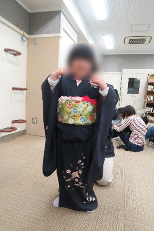 今回の会場は本校プレイルームです。男の子の和服に比べて、女の子の着物は手間と時間がかかっていましたが、色とりどりの着物に素敵な帯を結んで出来上がると、プレイルームはまるでたくさんの花が咲いたようでした。「わあ、すてき!」「きれい!」と先生たちからも歓声があがりました。着物を着た子どもたちは、いつもより姿勢よく立っていましたし、立ち居振る舞いも何となくきちんとしていたのが印象的でした。足袋や草履、下駄、扇子も見せていただき、最後に記念写真を撮りました。大変貴重な体験ができました。