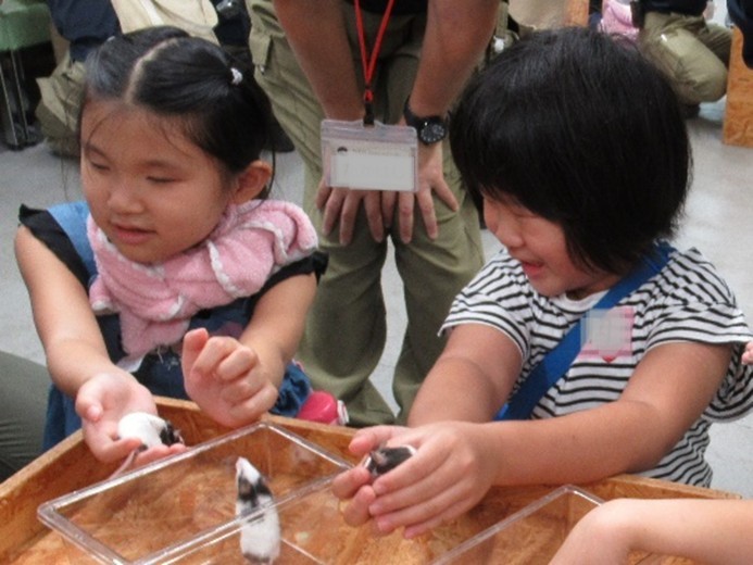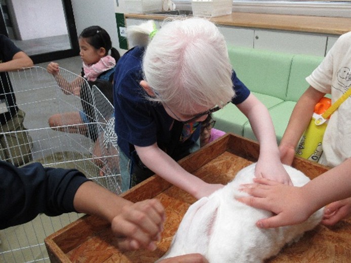 今年度のテーマは、「めざせ!モルモットはかせ」でした。まずは、モルモット、ウサギ、パンダマウスと触れ合うコーナーで、じっくり触って、からだの大きさや脚の様子、しっぽの違いなどを観察しました。ウサギには小さなしっぽが、パンダマウスには長いしっぽがあるのに対し、モルモットにはしっぽがないことを知りました。足の指の数を上手に確かめることができた児童もいました。また、モルモットのからだに聴診器を当てて、心臓の音を聞く体験もしました。