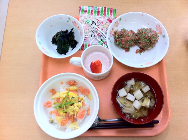 | 3月3日 鮭ちらしずし・三色しゅうまい・ほうれん草の磯辺和え・すまし汁・いちごミルクプリン・雛あられ 女の子のお節句、ひな祭りの献立は、近づく春を感じるかわいらしい色合いを大切にしました。ほうれん草の磯辺和えは意外な大人気メニューです。あまり人気のない青菜のお浸しですが、海苔を加えると人気メニューに早変わりです。 |