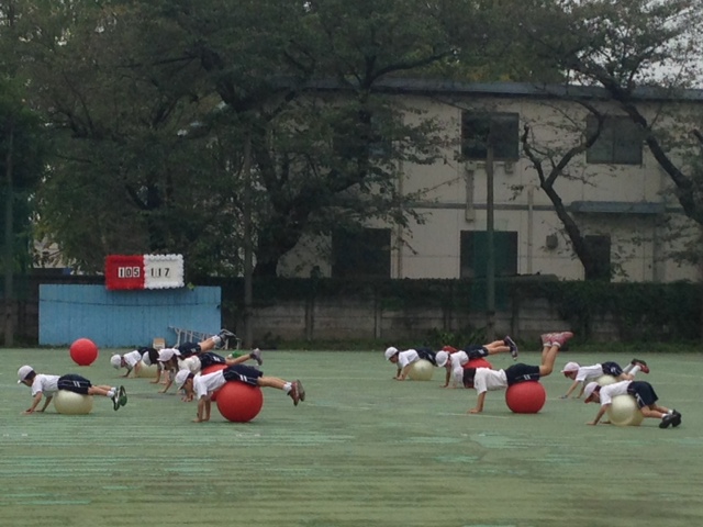 | 紅白に分かれての「応援合戦」 | Gボールを使った運動 |